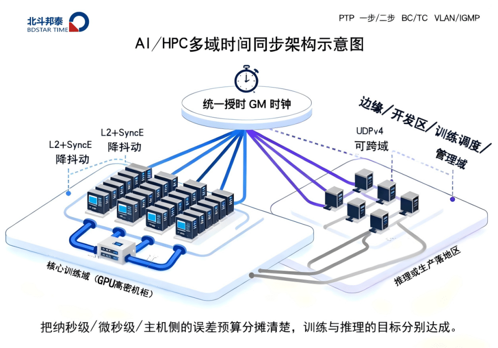 Die PTP-Domänen sind nach Unternehmen/Clustern unterteilt, und Training/Inferenz/Speicherung werden getrennt gesteuert, um einen geringen Jitter und eine Genauigkeit im Nanosekundenbereich zu gewährleisten.