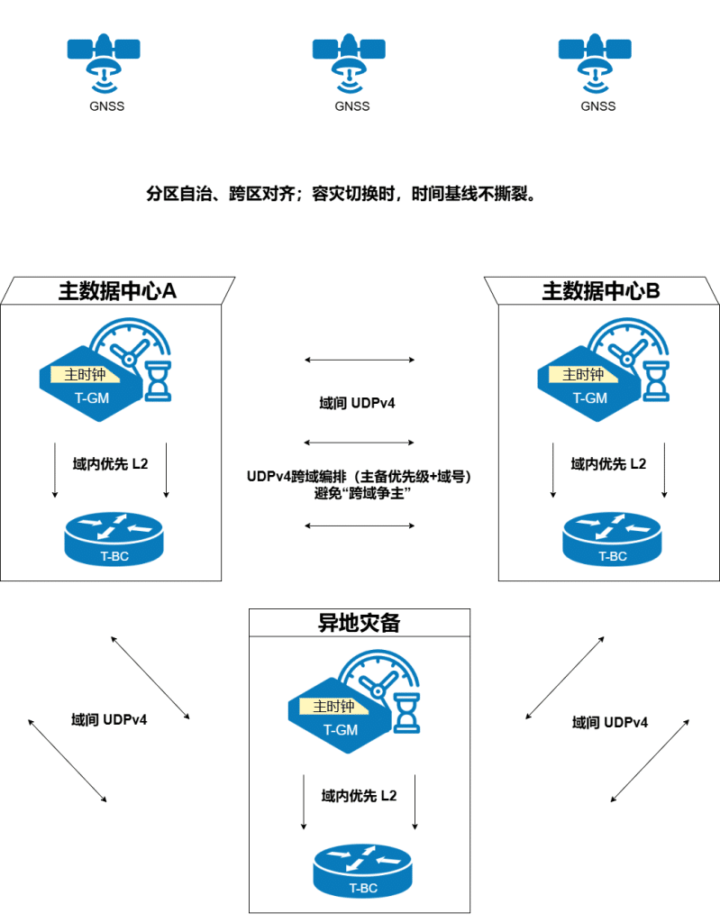 GNSS pro Standort + lokales GM, Domänensynchronisierungspolitik und Prioritätsumschaltung, Notfallwiederherstellung außerhalb des Standorts über UDPv4 zur Aufrechterhaltung von Durchdringung und Konsistenz.