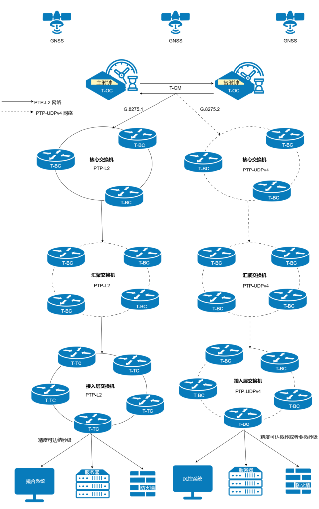Campus/multi-computer room expansion (multiple × T830): multiple T830s in each computer room select one as the domain T-GM, intra-domain core segments using L2 (G.8275.1 + SyncE), inter-domain using UDPv4 (supports L2 priority configuration L2); domain number/prioritized scheduling of multi-source disaster recovery is consistent with the steady-state, and the deviation of the overall system can reach the target of "transaction nanoseconds + logging microseconds + office milliseconds". Transaction nanosecond level + log microsecond level + office millisecond level" target. Layering by business importance to meet the target.