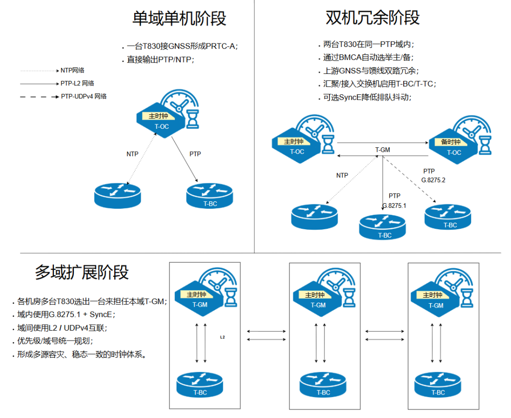 总原则:PTP 优先、NTP 共存;以现网最小改造为前提,由 T830 同时提供 PTP 与 NTP,任何阶段都能平滑切换。