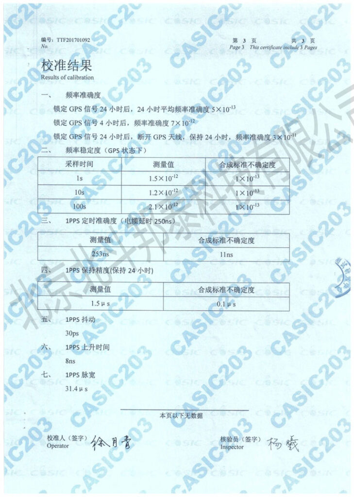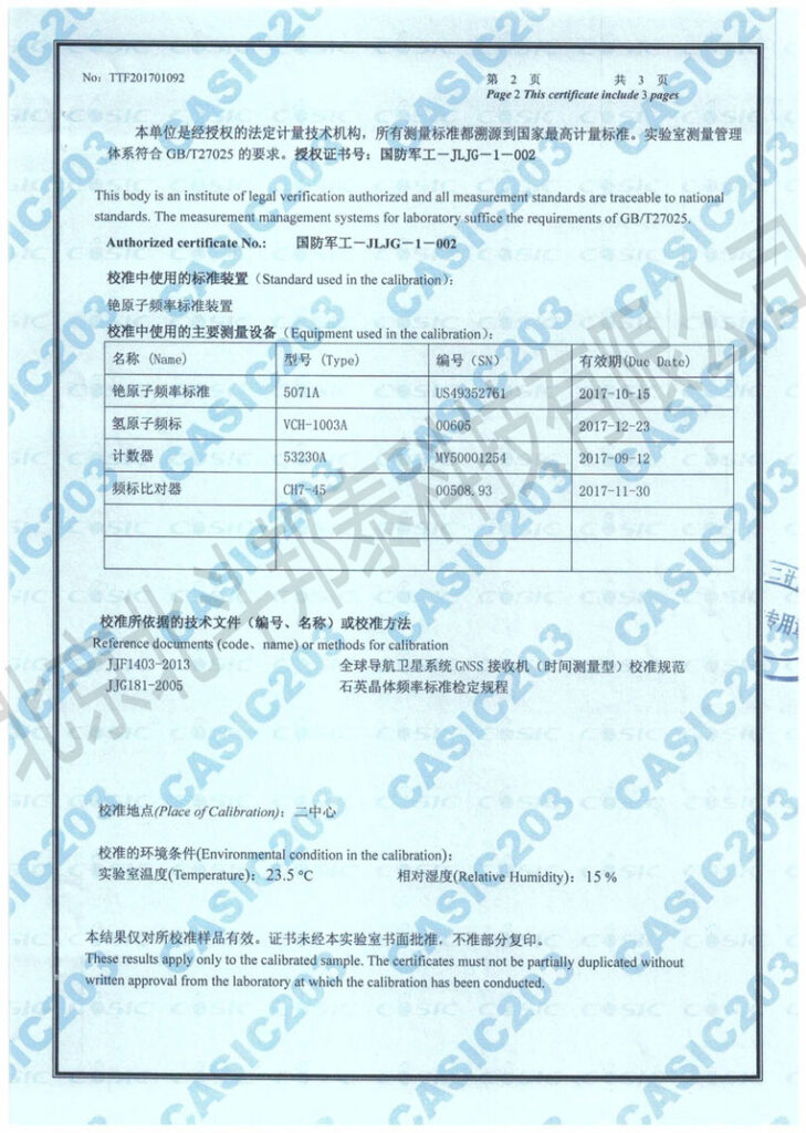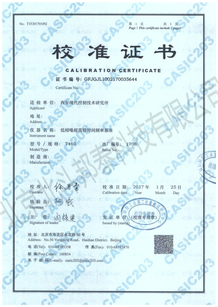 Recently, the procurement project of low phase noise and ultra-high stability time and frequency reference between Beidou Bontec and the No.203 Research Institute of China's Armaments Industry has passed the calibration of the Second Measurement and Testing Research Center of National Defense Science and Technology Industry, and the certificate of authorization No.: National Defense Military Industry-JLJG-1-002.
