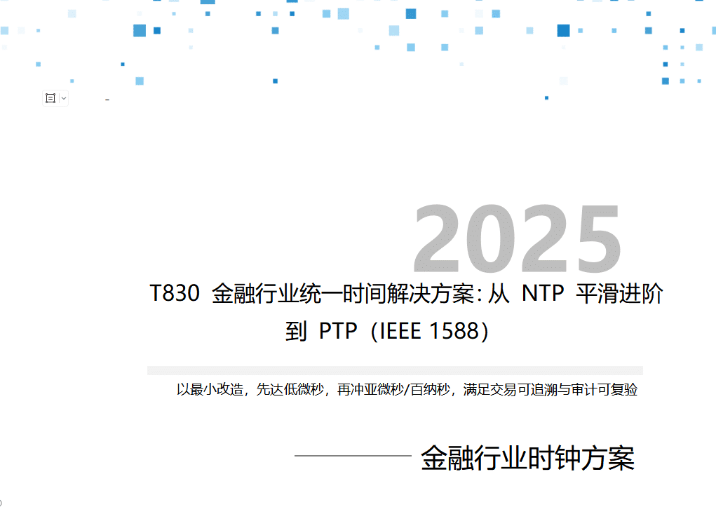 在金融生产网里,时间不是“尽量接近”,而是“必须一致且可追溯”。仅依赖 NTP 时,跨三层与拥塞引发的排队抖动与路径不对称,会把偏差和尾部风险放大到毫秒—微秒量级;PTP 通过网卡/交换芯片的硬件时间戳、边界/透明时钟与(可选)SyncE,将“源—网—端”的误差从不可控浮动变成可预算、可归因、可审计的工程量。以 T830 为核心,不打断现网 NTP 的前提下,先把关键链路稳定到低微秒级,在受控核心段收紧到亚微秒/百纳秒级,以最小改造换取最大可验证性与合规确定性。